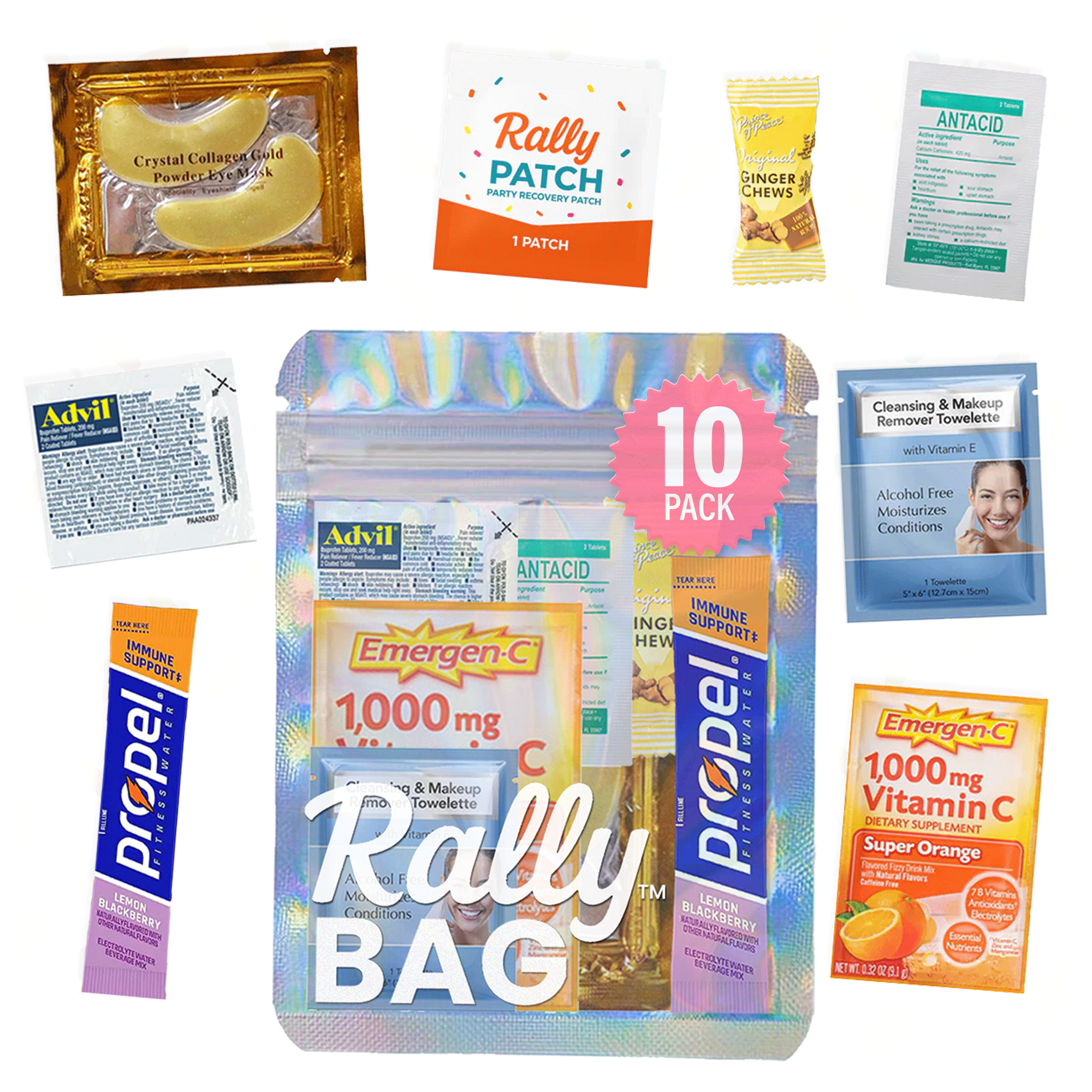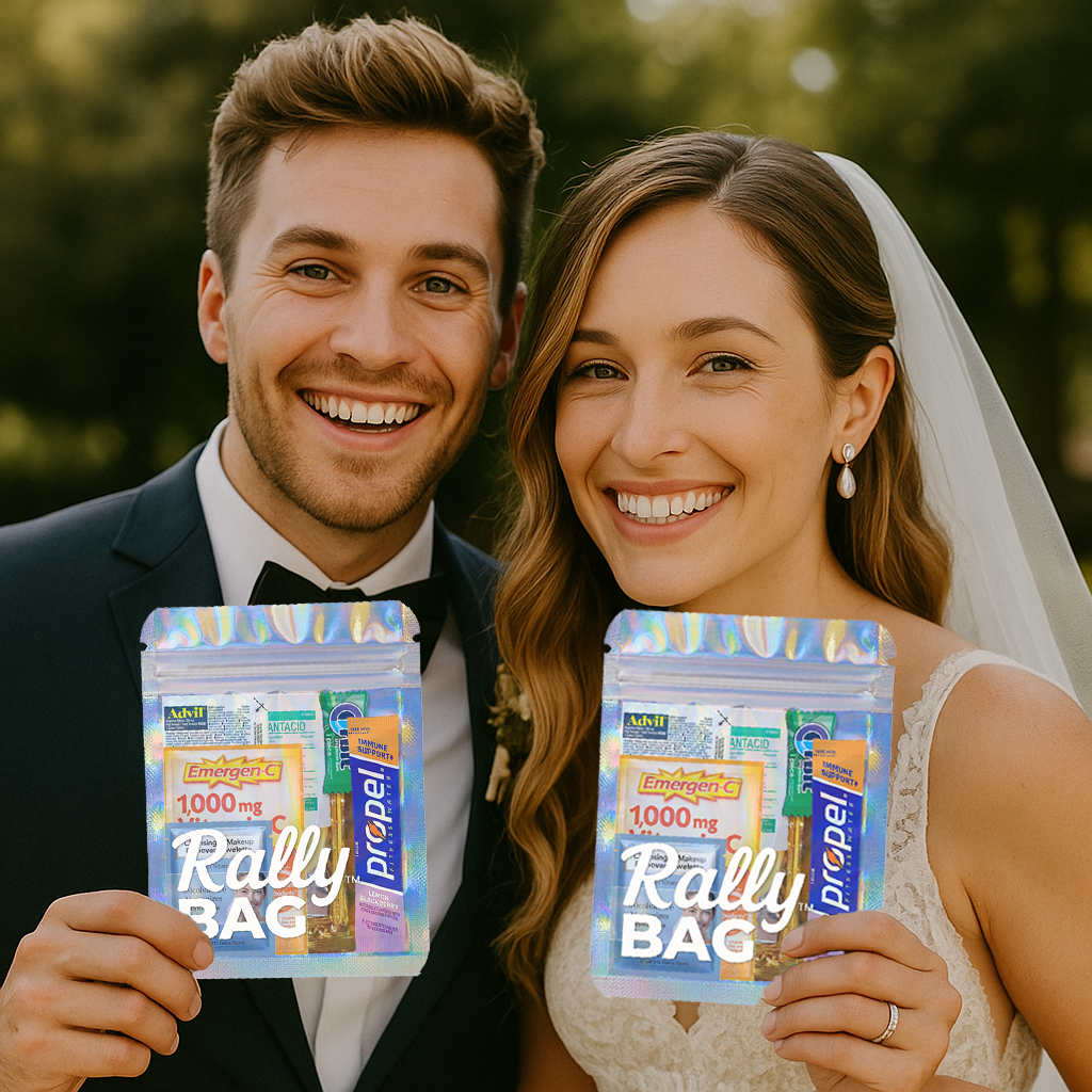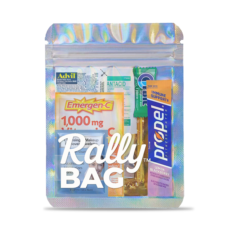 No more scrambling for Advil or chugging mystery concoctions. The Rally Bag™ is your secret weapon for staying ahead of the next day dread. Packed with carefully curated essentials, it's the ultimate next-day lifesaver for bachelorettes, weddings, concerts, and big nights out.